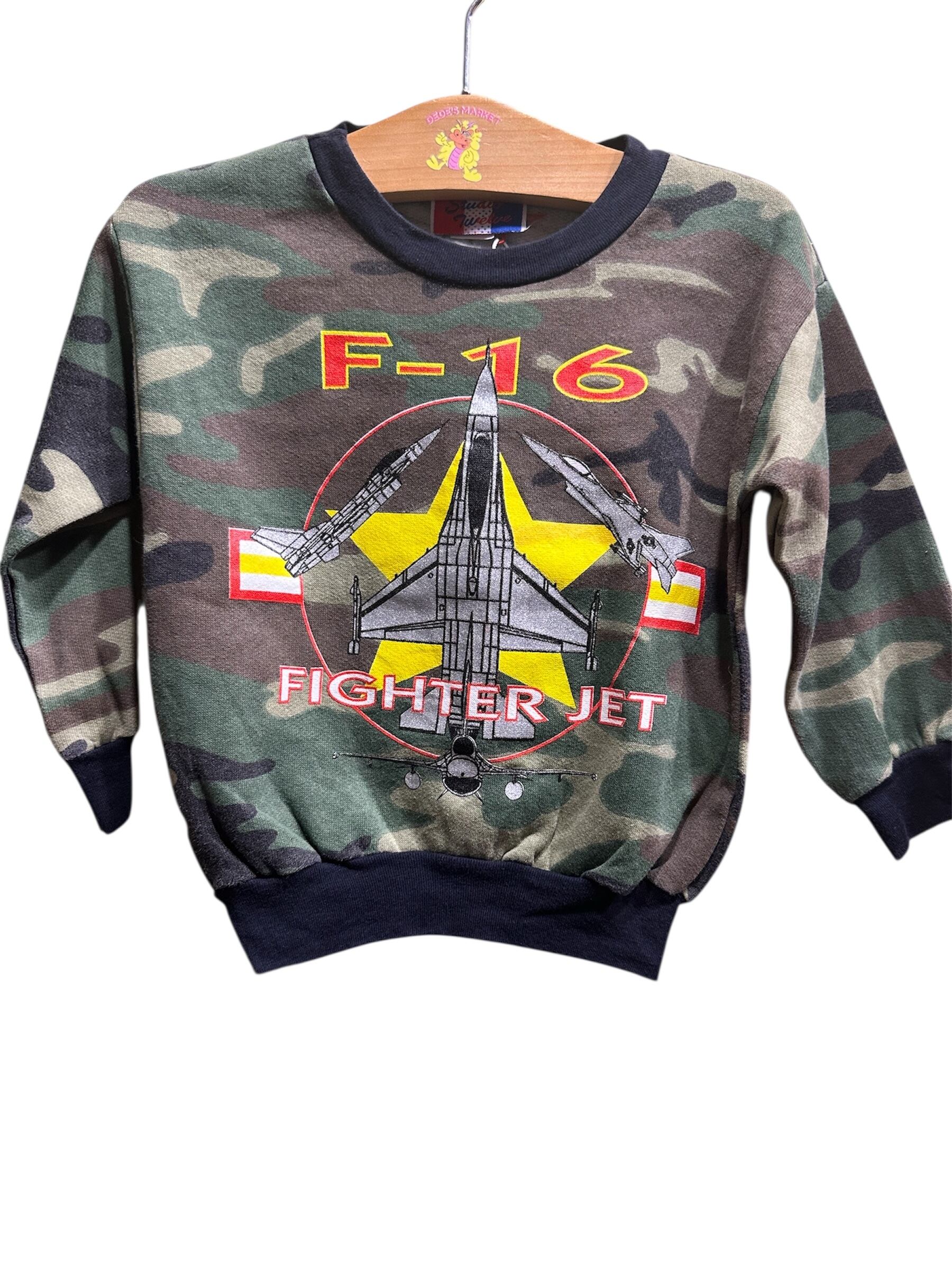 当時のキッズ服では珍しい総迷彩に、大判のF-16ファイタージェットプリントを重ねた迫力のある1枚